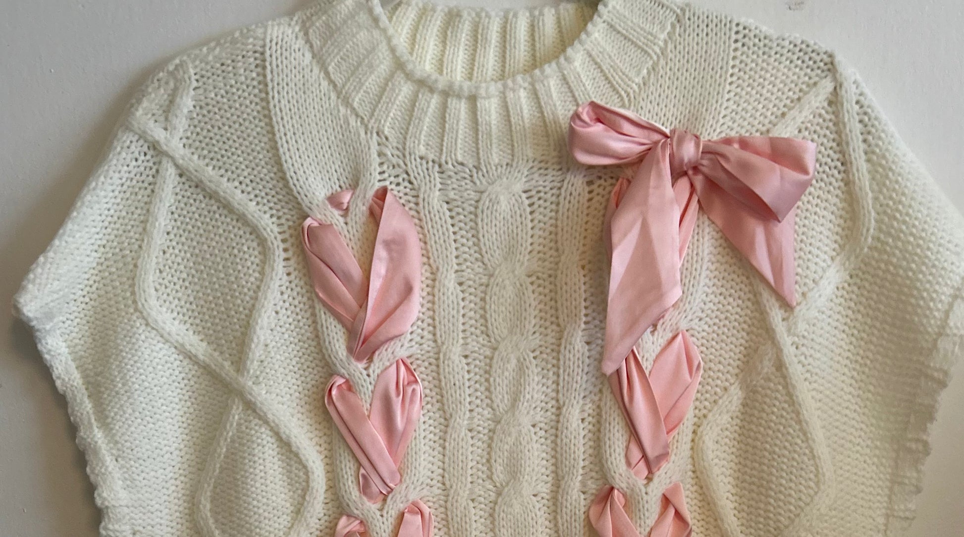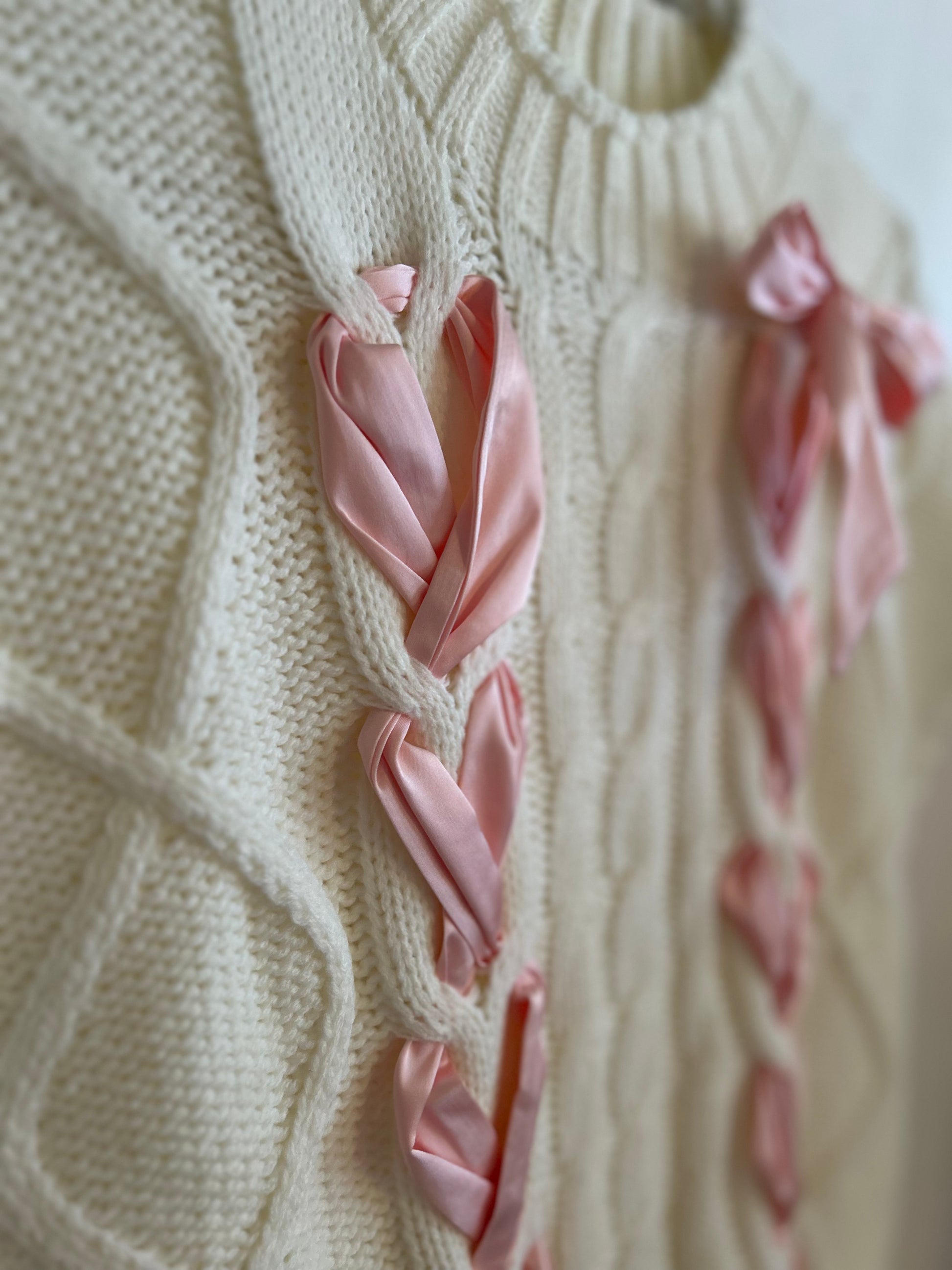 This gorgeous cable knit sweater features two strings of satin ribbon that are intertwined within the sweater. The sweater also has wide cut sleeves past the shoulder and a round neckline to keep you comfortable! This sweater can be casual and chic with your favorite denim or dressed up with a skirt or trouser perfect for any occasion.