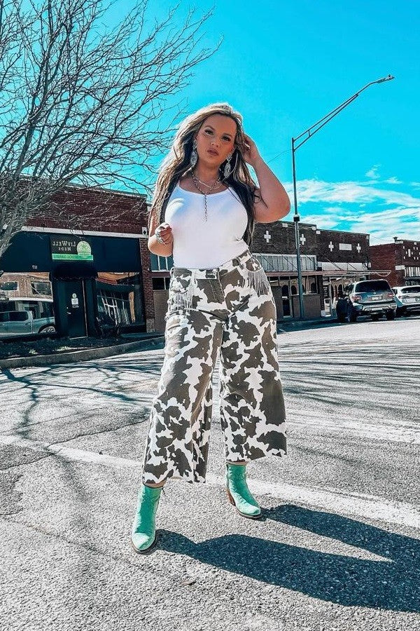 High rise printed denim crop wide leg jeans with rhinestone fringe detail on the front pockets. 5 pockets. Comfortable adjustable elastic waistband so there are no gaps in your waistline. Curved back yoke that makes the butt look better. Super soft and stretch fabric for the best comfort. High Rise Tummy Control Reinforced Belt Loops Butt Shaping Gap Control Waistband Inseam: 28in Model Wearing: Size 6 nfr western rodeo