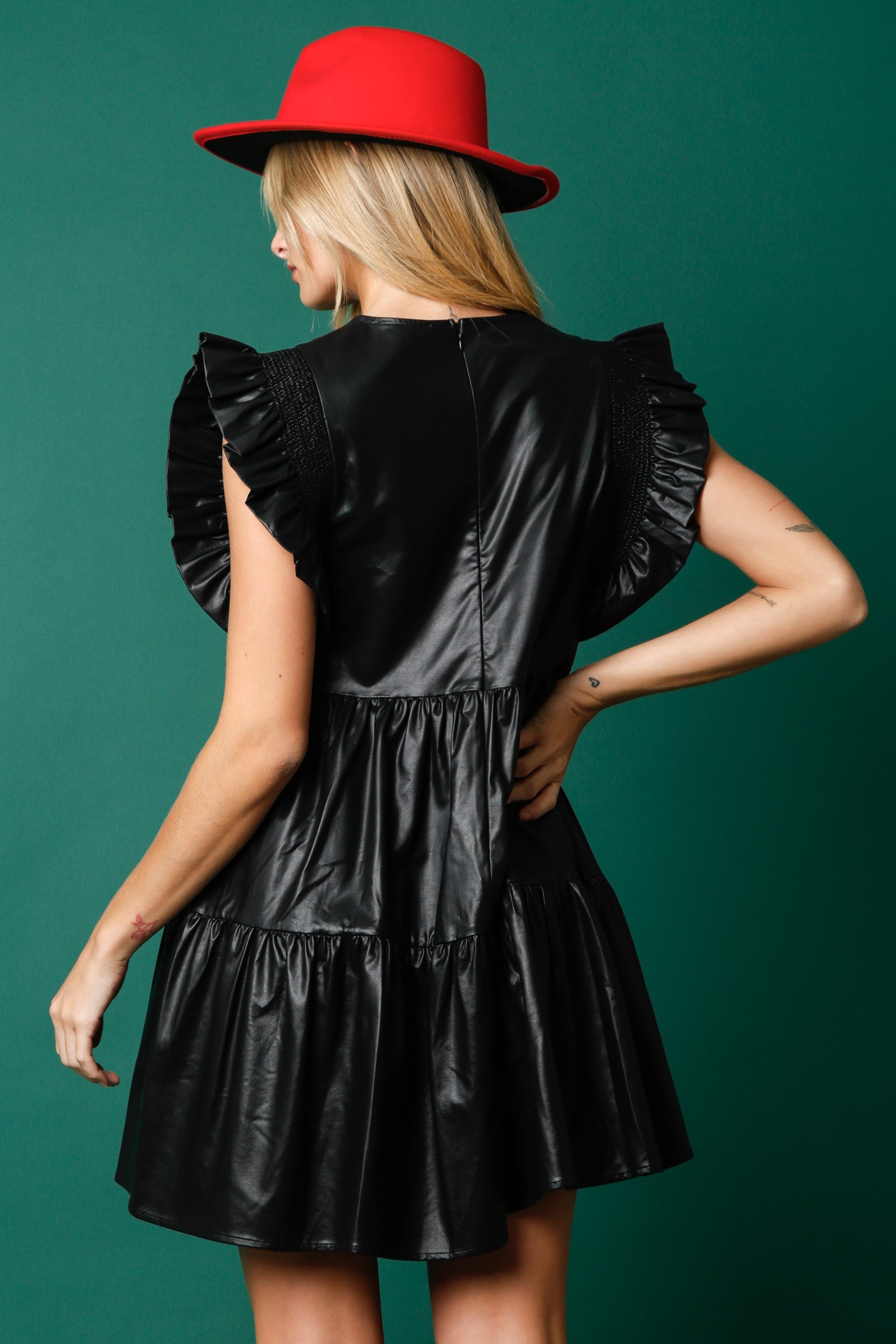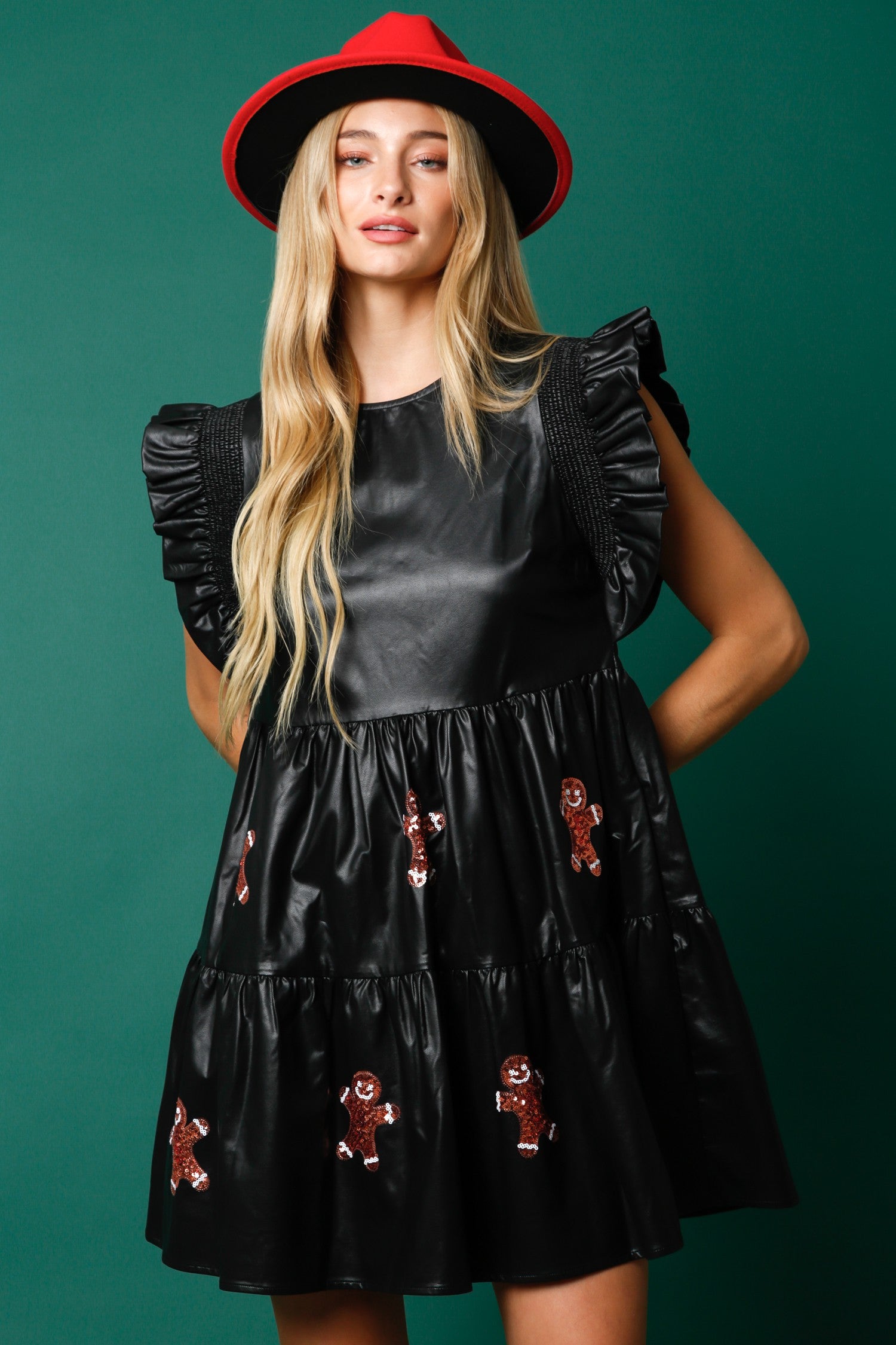 Sweet meets edgy in this adorable holiday dress. Crafted from a sleek faux leather material, this tiered mini dress features playful sequin gingerbread men for the perfect festive touch. The ruffled shoulders add a feminine flair, while the relaxed silhouette keeps it comfy and flattering for all-day wear. Pair it with boots and a bold hat for a standout seasonal look. A must-have for holiday parties, photos, and festive fun!