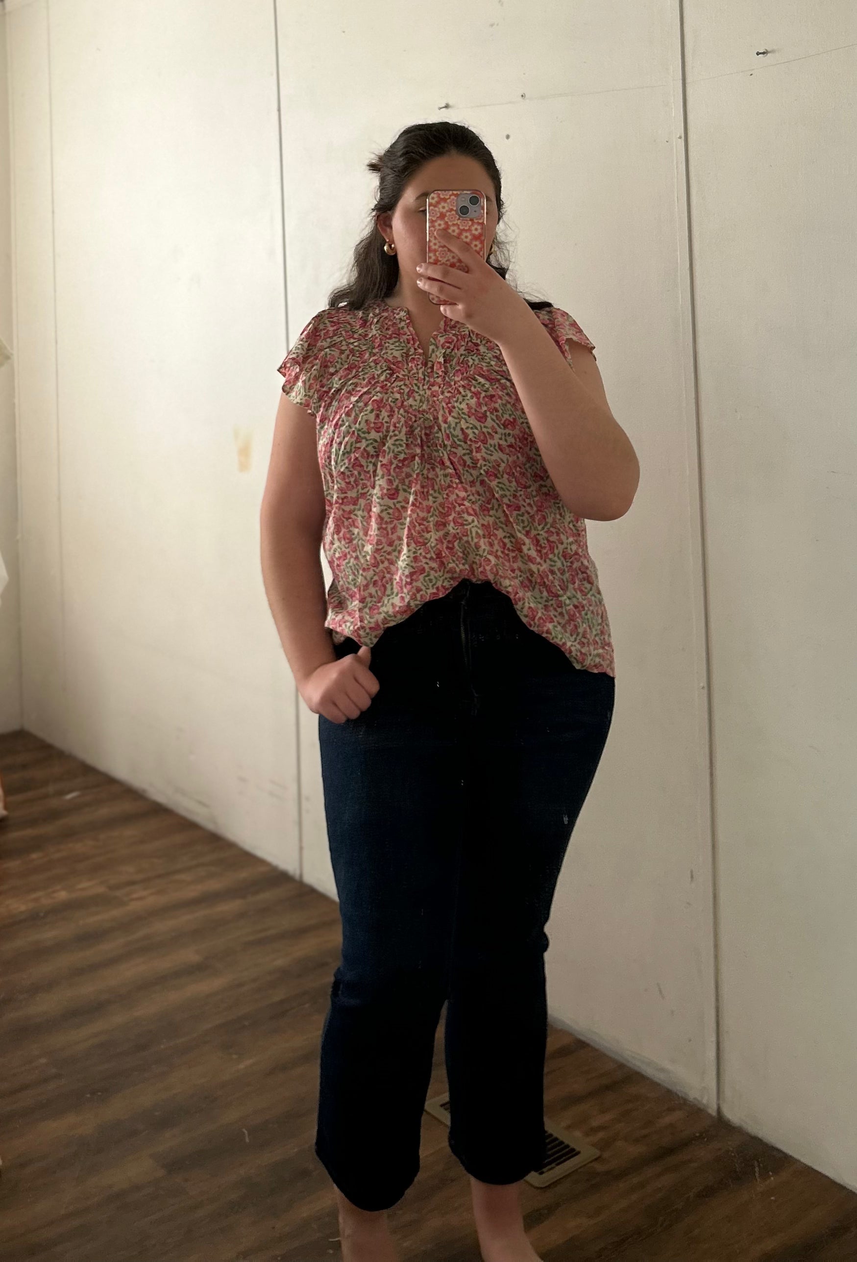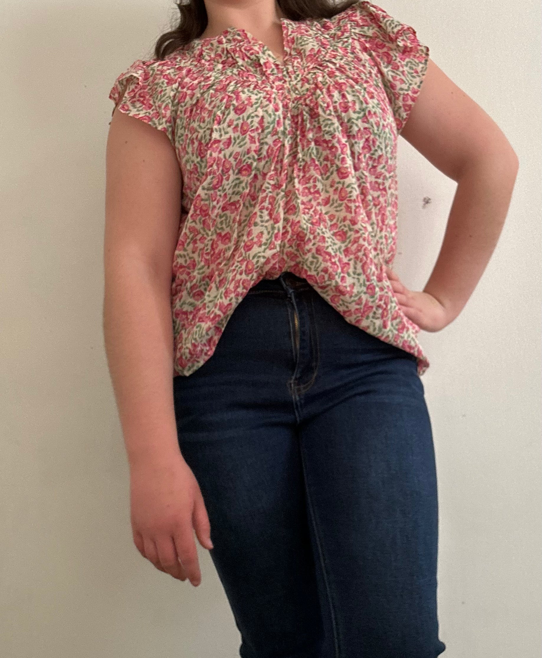 This top is a light weight floral material with a gorgeous floral pattern. The V neck cut and ruffled sleeves that end just over the shoulders. This beautiful flowy top is perfect paired with jeans or denim shorts!